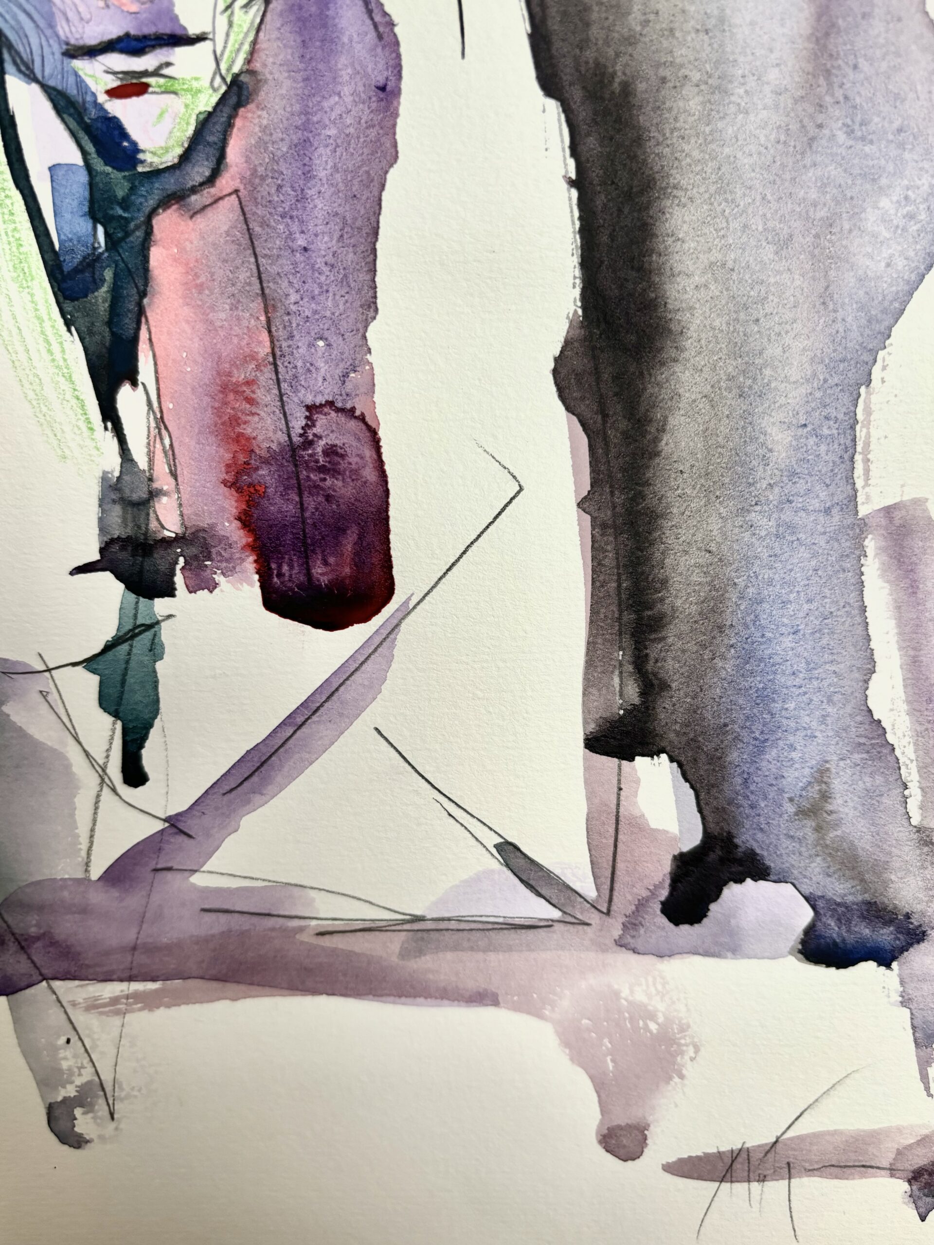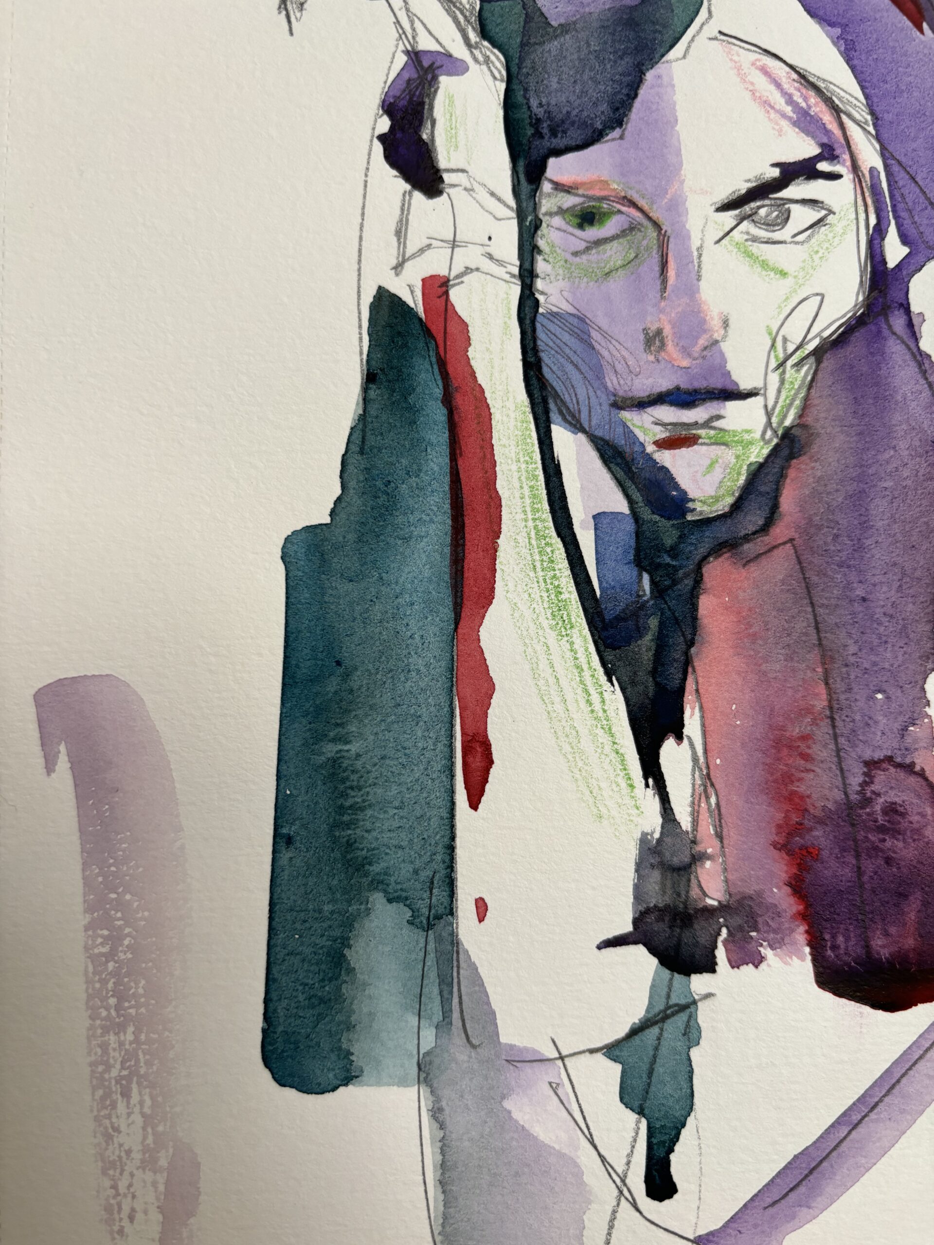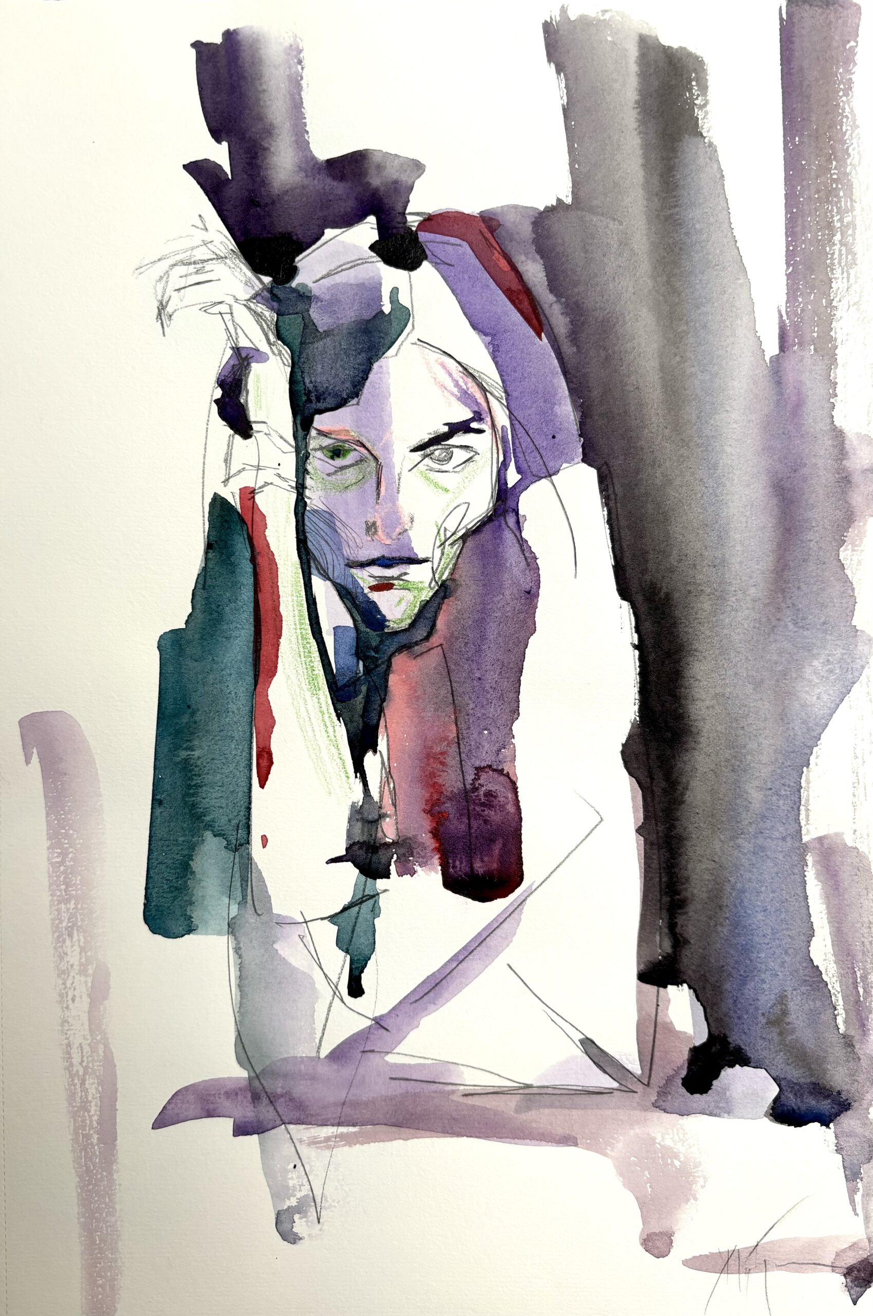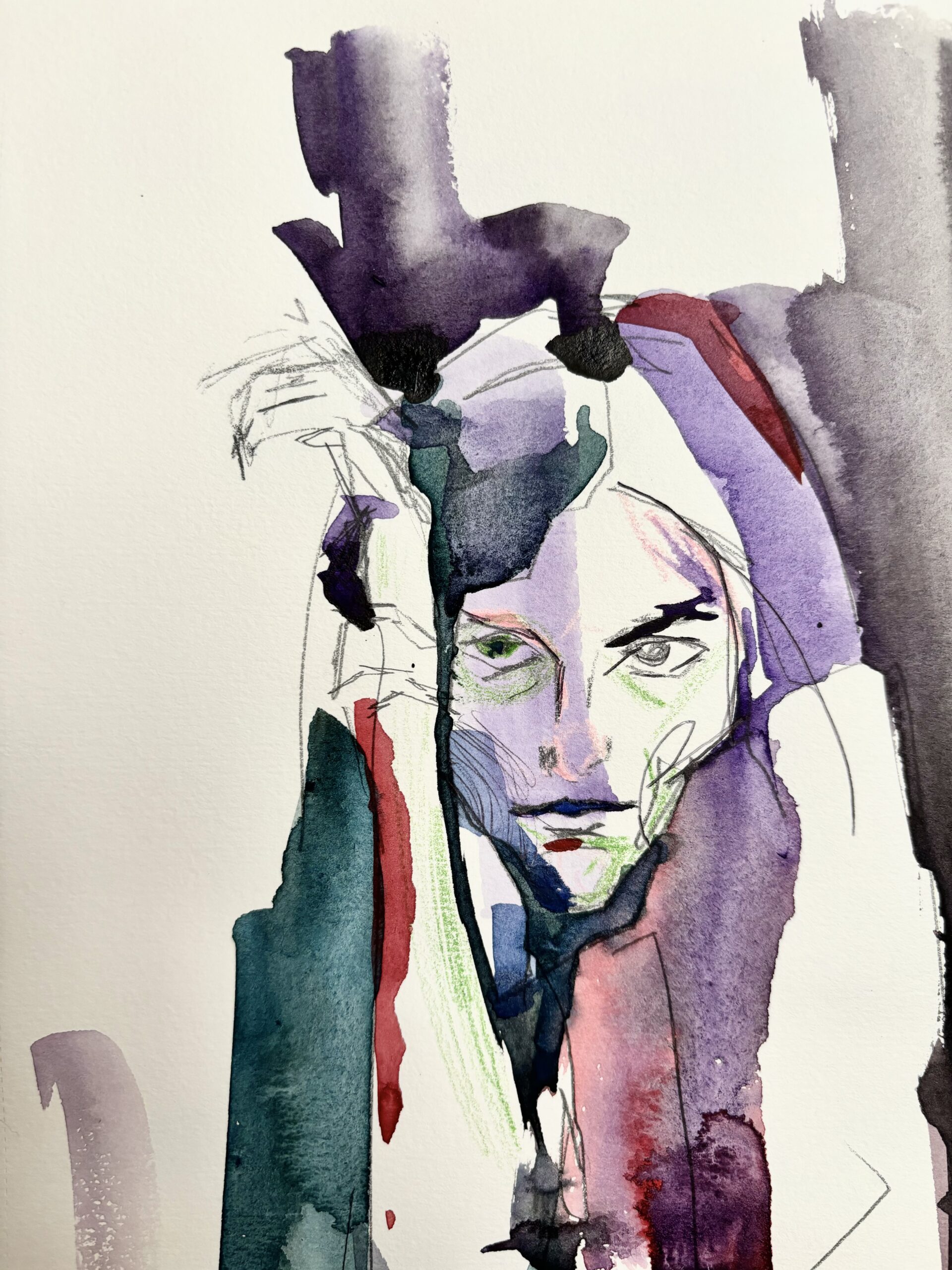 Una figura emerge desde la niebla de sus propios pensamientos, fragmentada entre luces y silencios. «Entre Sombras» es un retrato emocional que juega con lo inacabado y lo transparente, como si el alma asomara sin permiso entre los trazos. La combinación de acuarela, lápices y bolígrafo da forma a un lenguaje íntimo, casi susurrado, donde la expresión surge más de lo que se sugiere que de lo que se muestra.