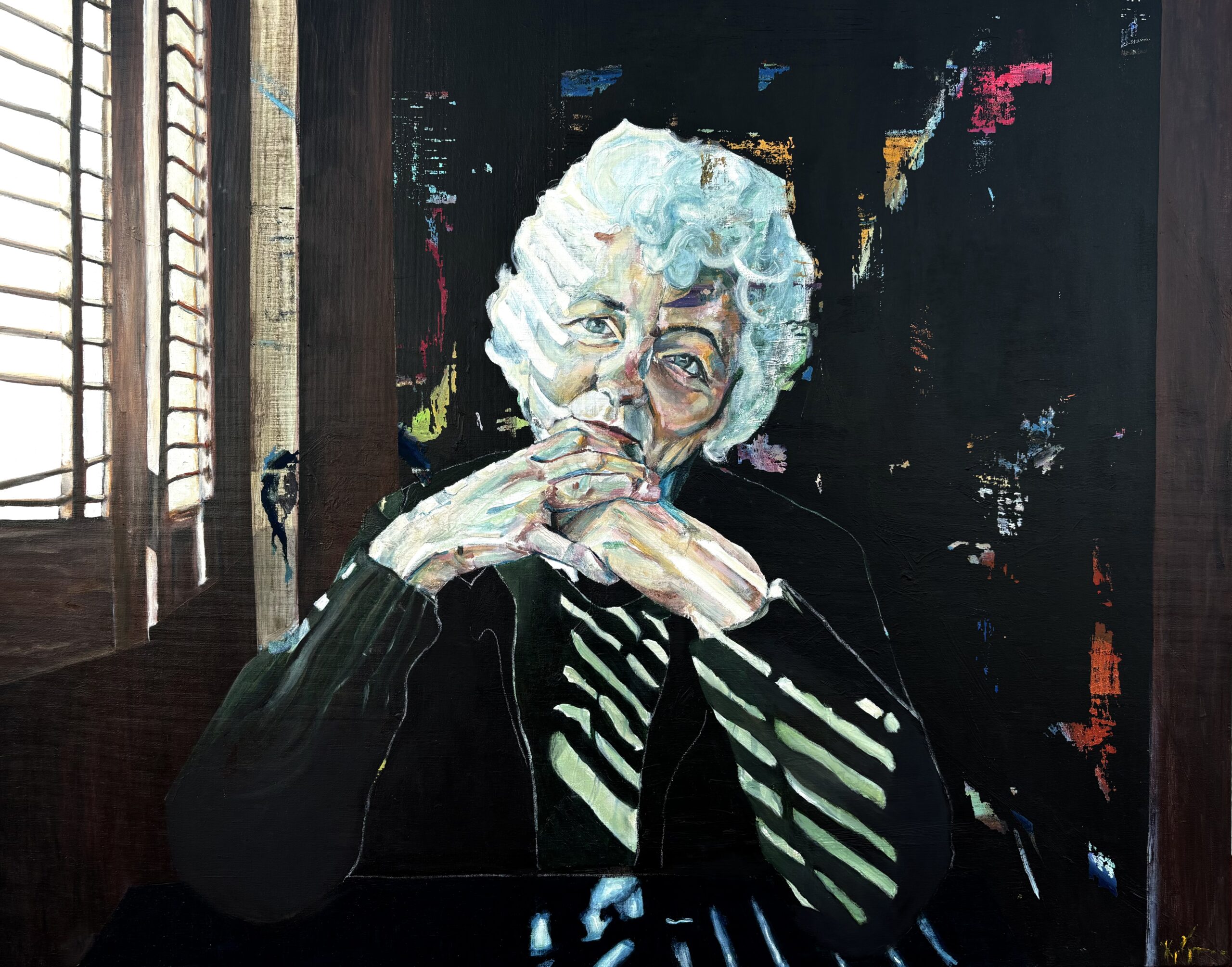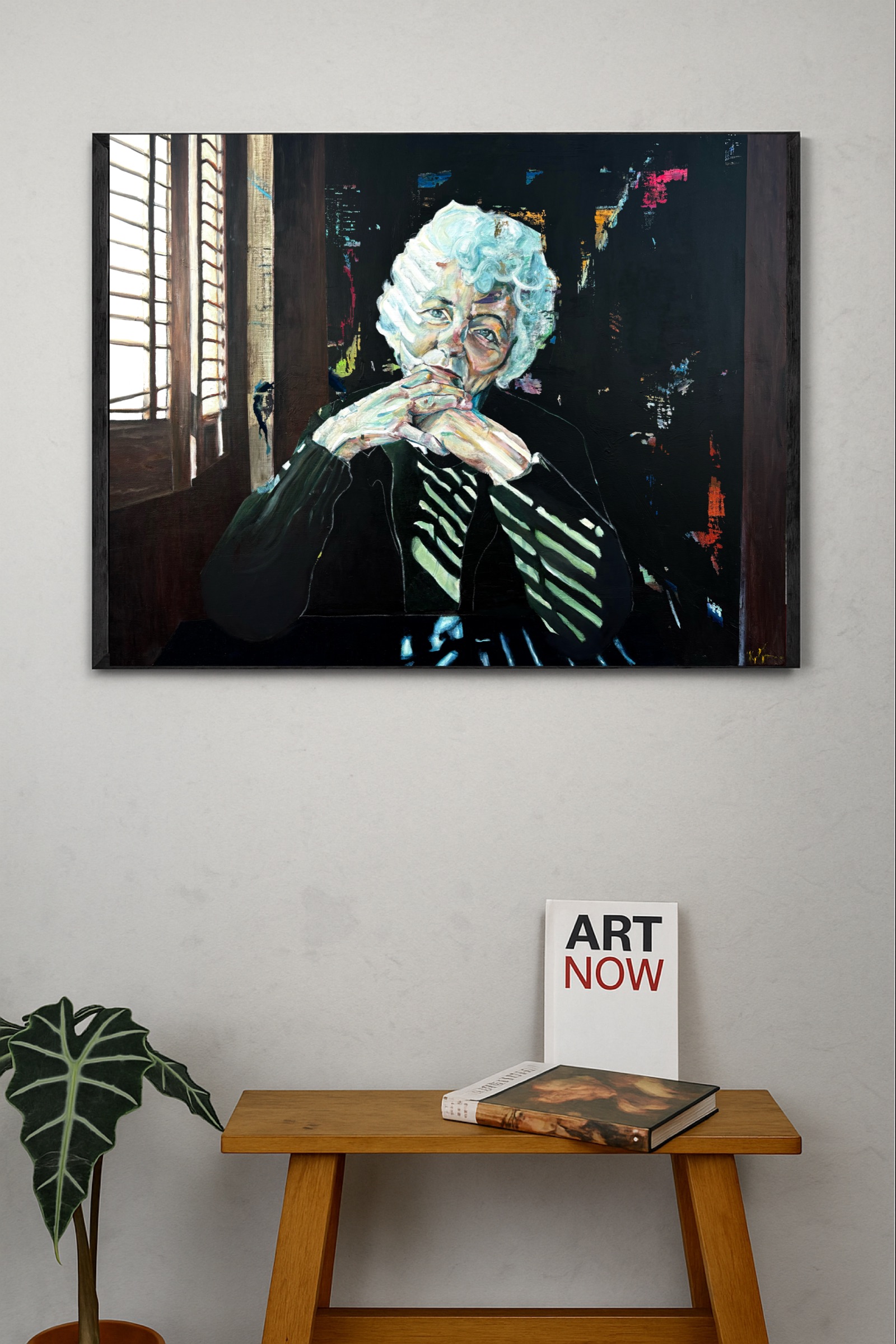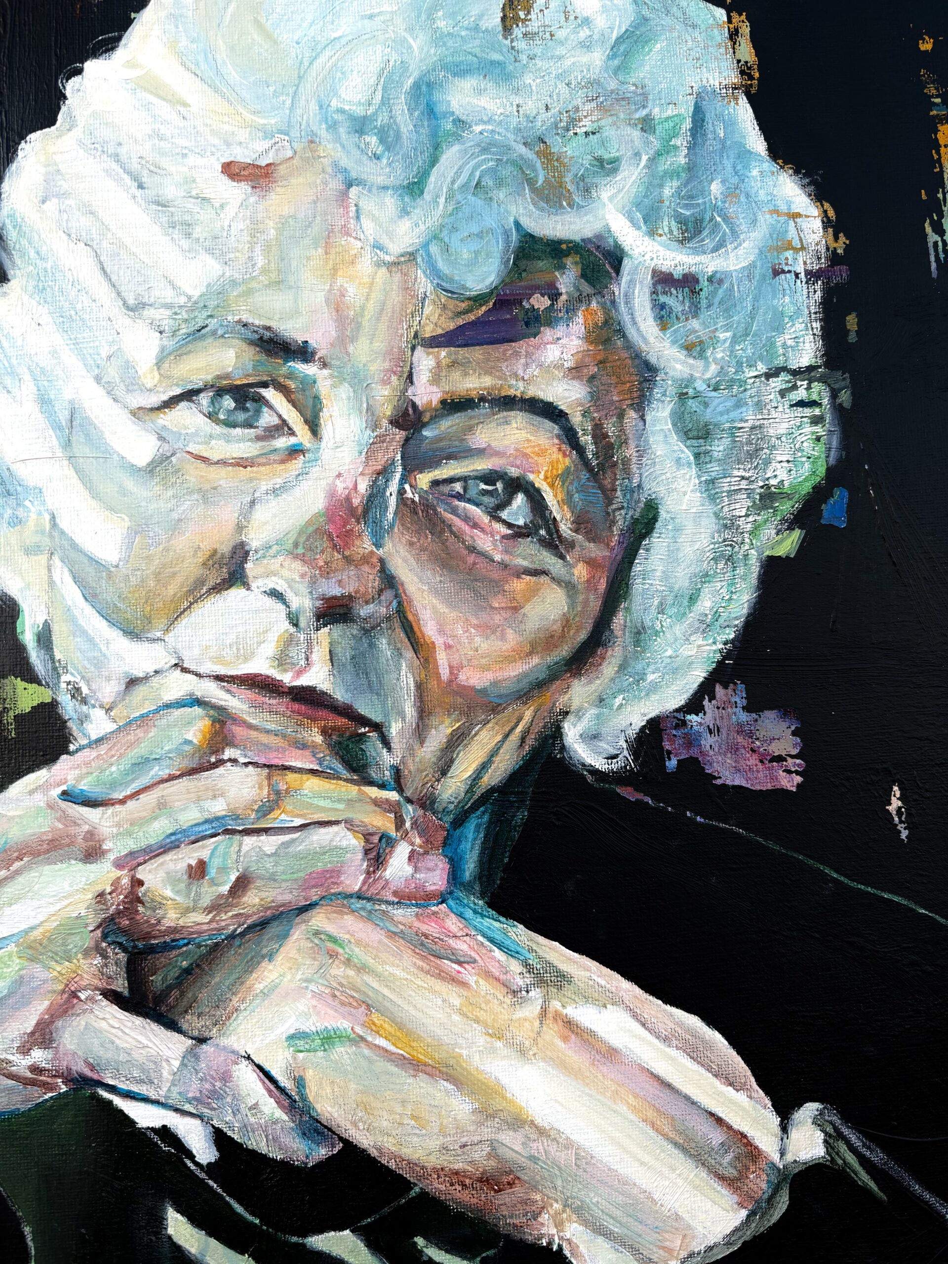 Así que, tras decidirme a hacer este dulce retrato y cubrir el fondo de negro, me dispuse a arrancar con celo algunas partes de la locura de colores que ya existía debajo (tenía miedo). Me encanta cuando la obra también colabora en el proceso creativo. Al final, no tenía ni idea de qué cantidad se iba a desprender ni si siquiera si iba a salir bien, pero confiaba… y efectivamente, quedó estupenda.